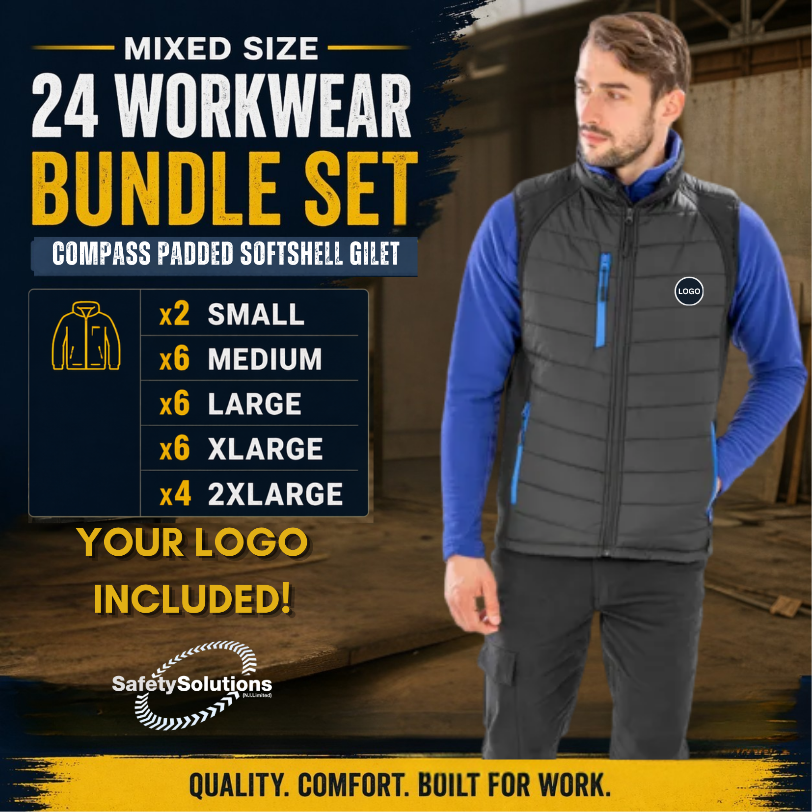 Upgrade your team workwear with this 24 piece mixed size bundle of Compass Padded Softshell Gilet. Designed for comfort, durability and everyday performance, these jackets are ideal for staff uniforms, trade teams, warehouses, site workers and outdoor professionals. Only £23.95 per item!