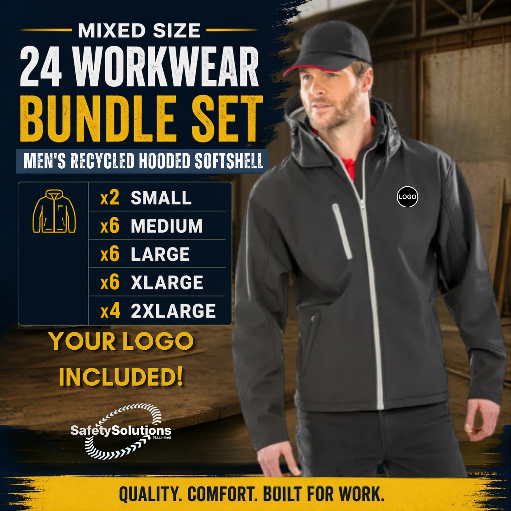 Upgrade your team workwear with this 24 piece mixed size bundle of Men’s Recycled Hooded Softshell. Designed for comfort, durability and everyday performance, these jackets are ideal for staff uniforms, trade teams, warehouses, site workers and outdoor professionals. Only £23.95 per item!