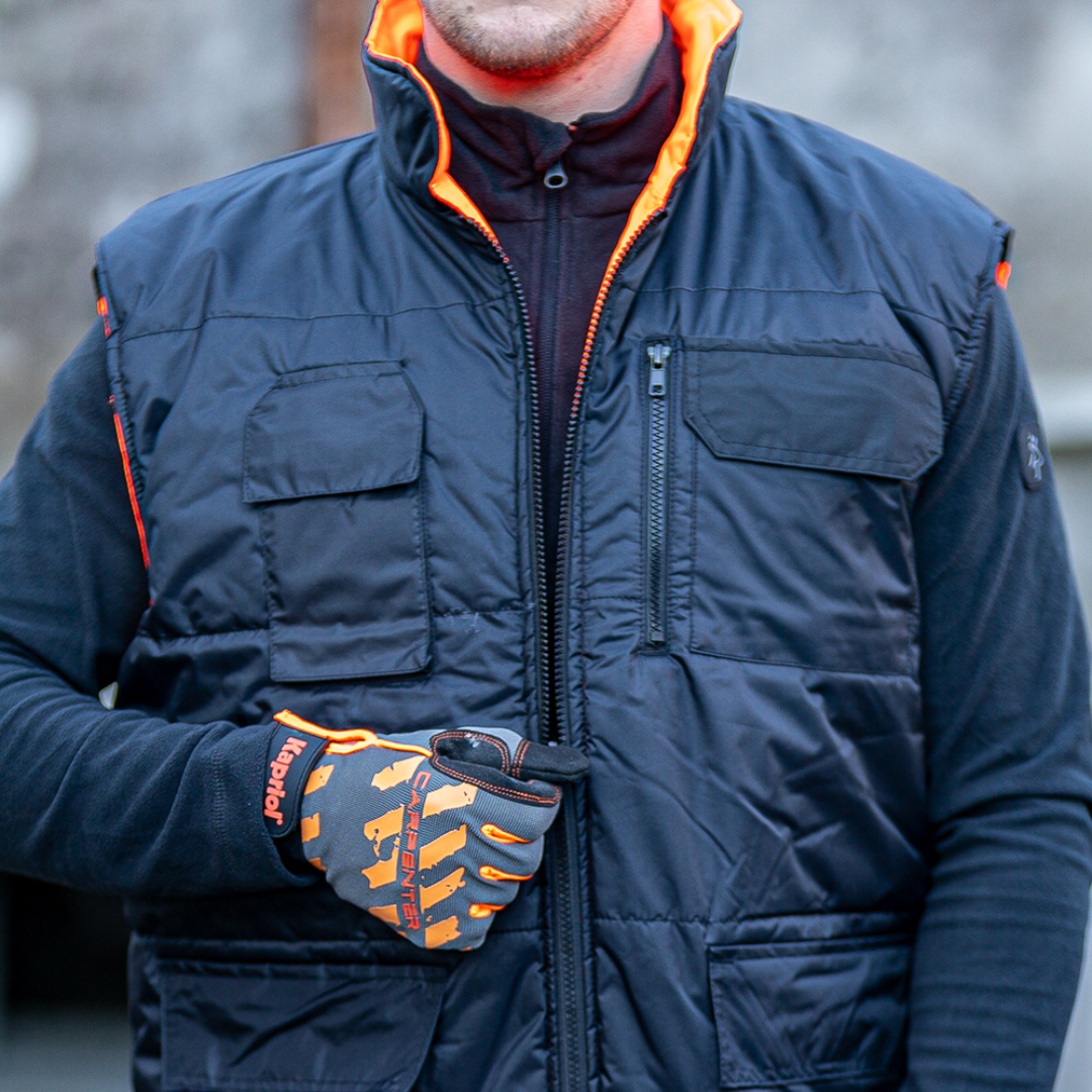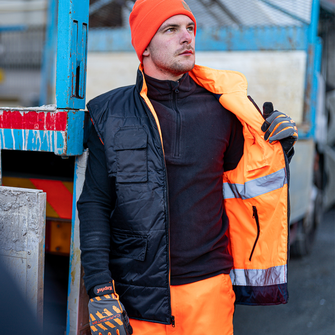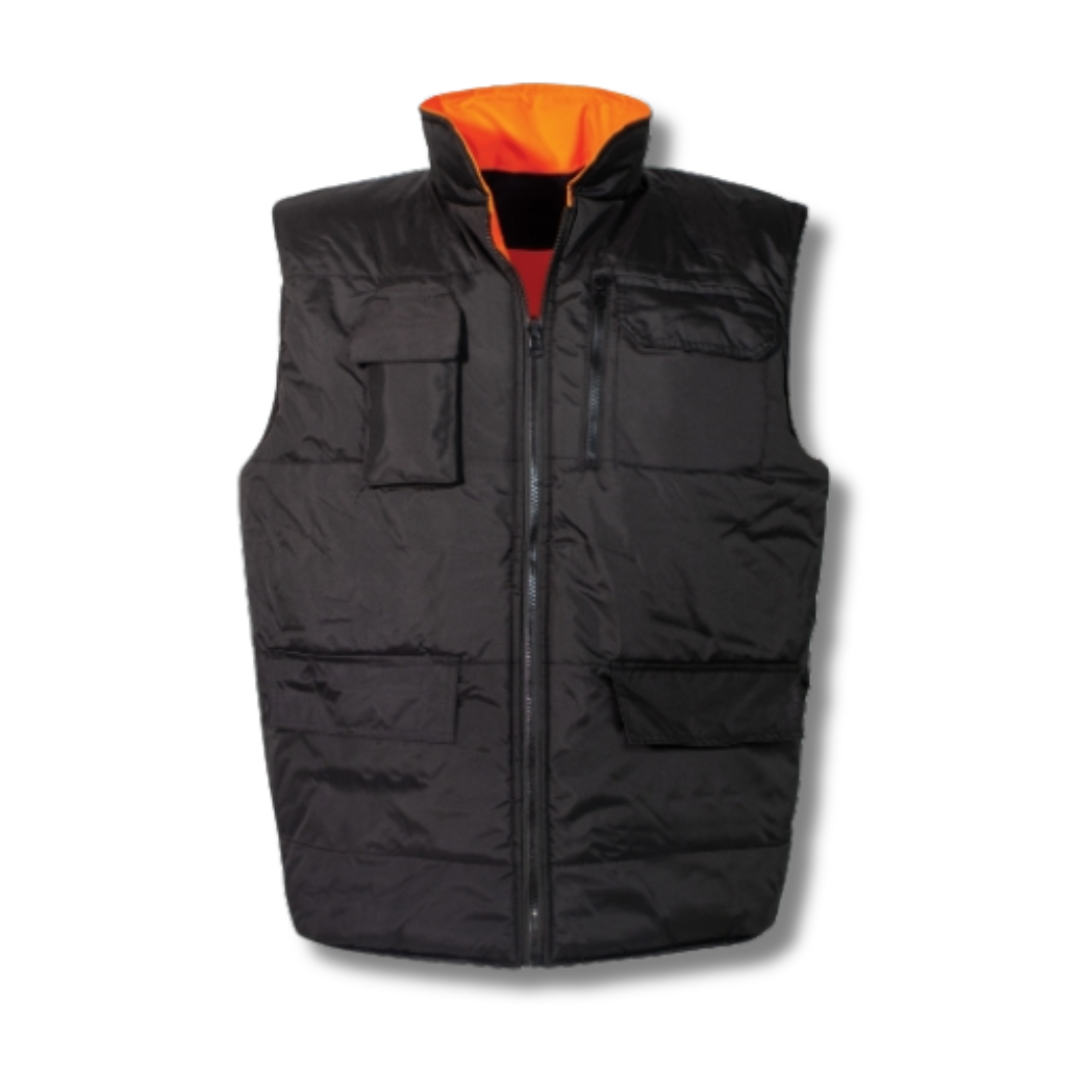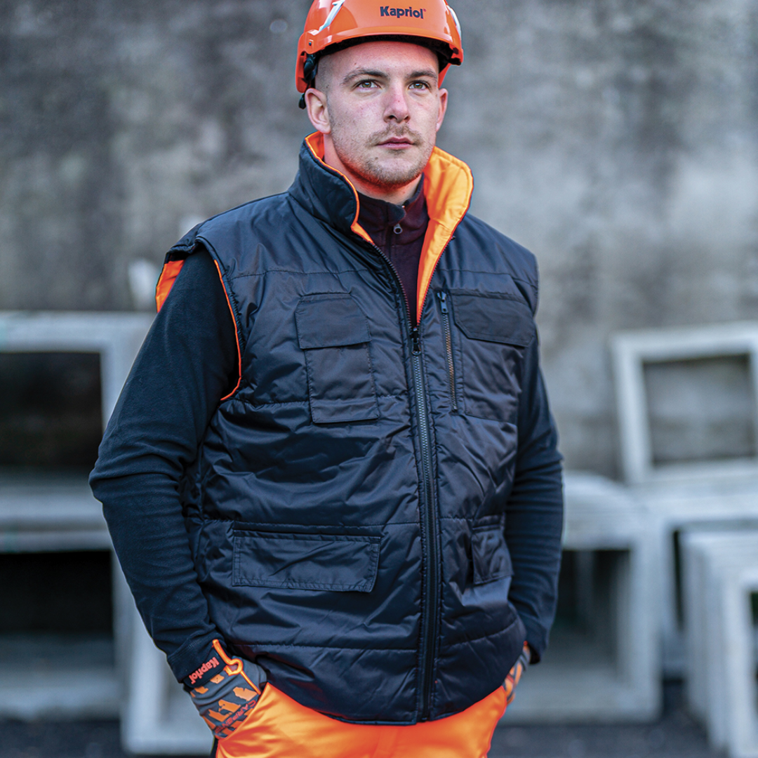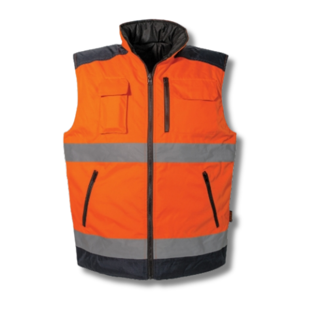 Reversible high-visibility work vest which, on one hand, guarantees wide visibility thanks to the presence of reflective bands and, on the other hand, features padding with four handy pockets with velcro fastening flaps.